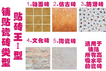 适合铺贴所有高吸水率的瓷砖,大小都可以,比如:釉面砖,仿古砖,防滑砖,文化砖,外墙砖,陶瓷砖等。