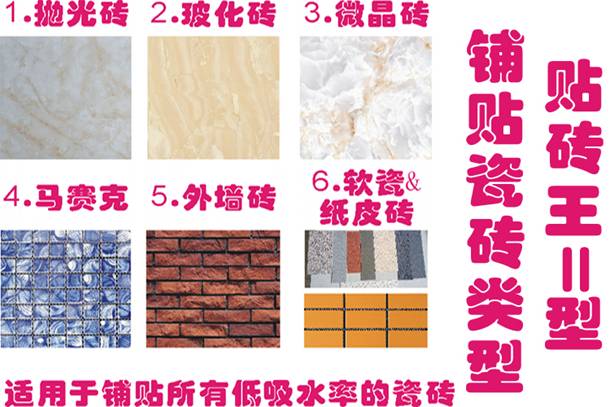 适合铺贴所有低吸水率吸水率的瓷砖,大小都可以,比如:玻化石砖,抛光砖,微晶石砖,马赛克,外墙砖,软瓷/纸皮砖等。
