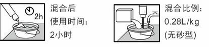 将粉状填缝剂逐量加入预先准备的清水内,混合比例:1份水+约3.5份填缝剂,将填缝剂与水充分搅拌至润滑均匀,无明显块状或糊状结块。将搅拌后待施工浆料静置2~3分钟,在稍加搅拌,即可使用